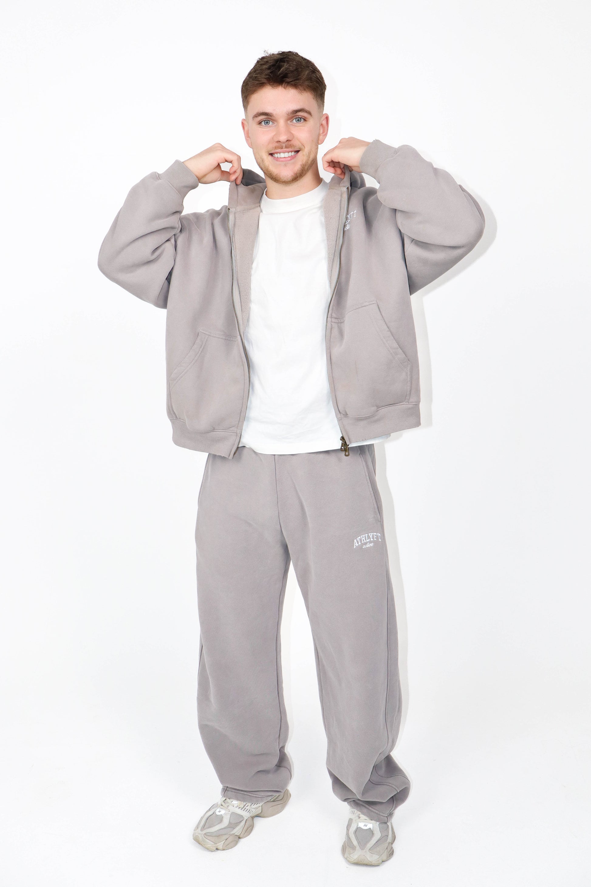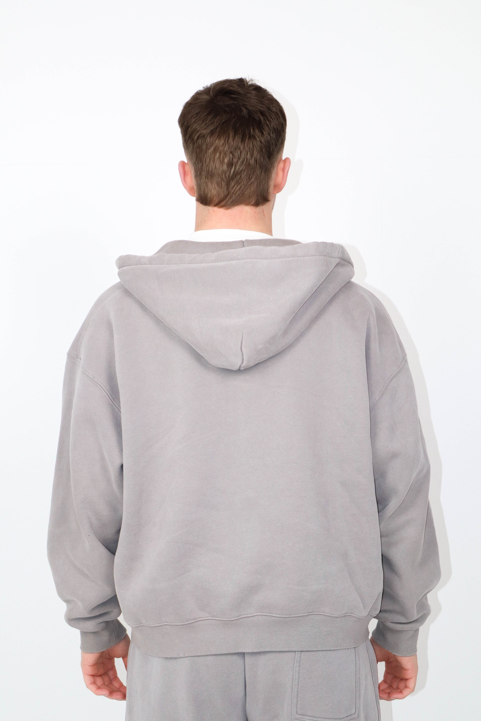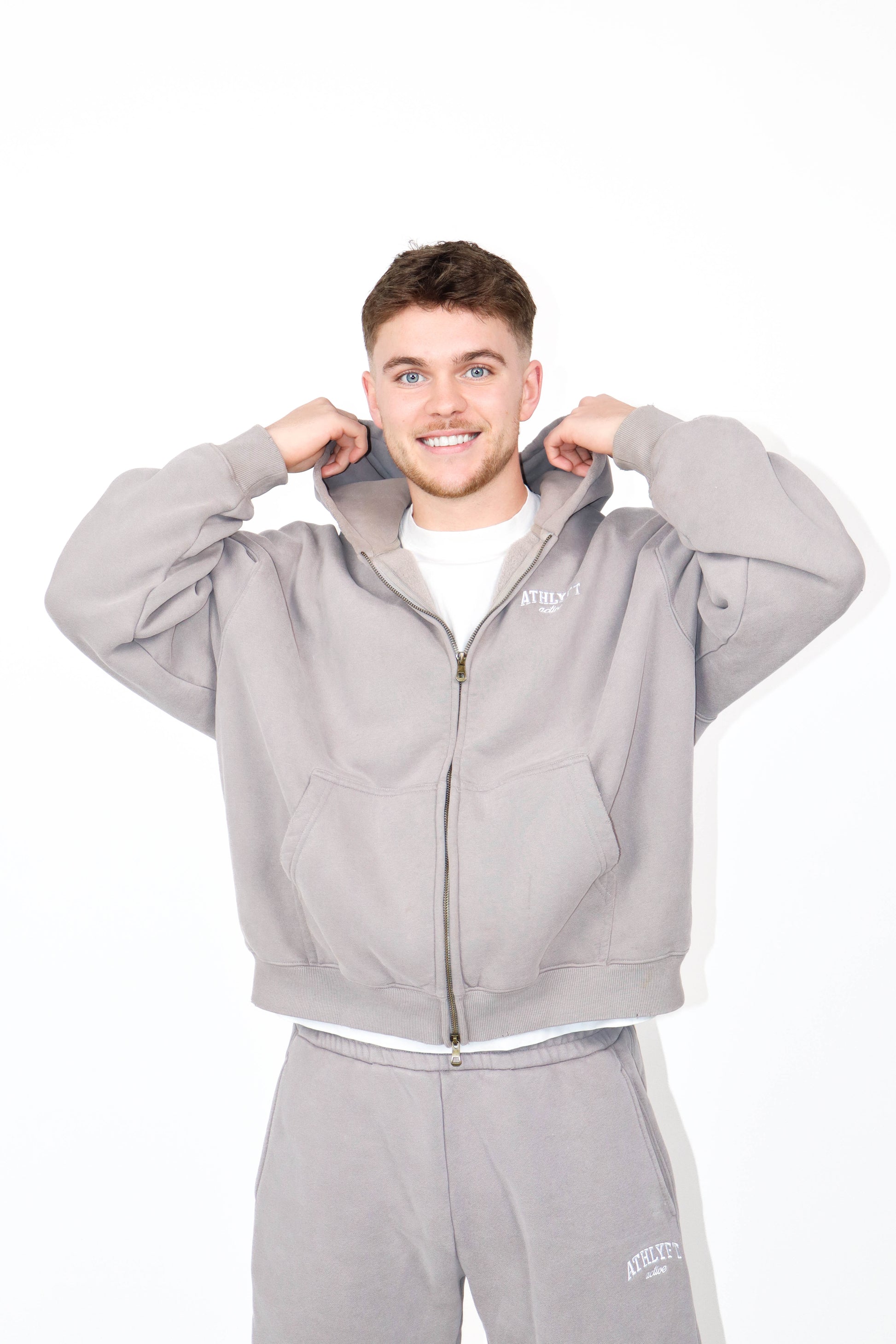 This oversized double zip hoodie is crafted from heavyweight 380GSM cotton blend with a stonewash finish for a worn-in feel. Designed with double brass hardware, raw edge detailing, and minimal ATHLYFT active white embroidery for a clean, elevated look. An easy unisex fit built for everyday wear.